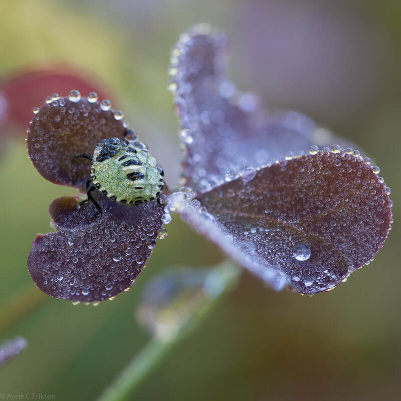 Det er siste helg i september. Det har vært mange duggmorgener de siste dagene, og det er alltid morsomt å fotografere duggbelagte insekter. De krabber fram når sola kommer for å bli kvitt nattens dugg. Ellers er det åpenbart tegetid, og i år har de lagt sin elsk på en hageplante som heter virginialeddblom (Physostegia virginiana). Planten er klassifisert som fremmedart, opprinnelig fra Nord-Amerika. Fremmed eller ei, den er umåtelig populær blant teger, sommerfugler, bier, maur, fluer og alt som kan krabbe og fly.