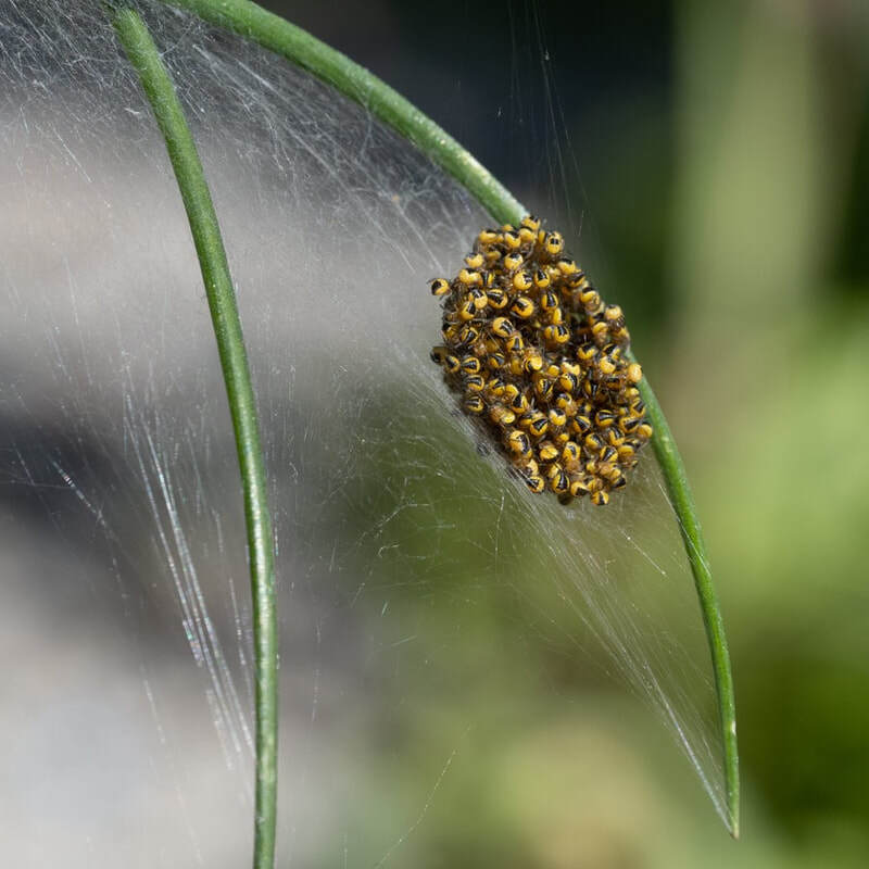Korsedderkopp (Araneus diadematus) er det mange av her, i alle størrelser.  Mer info om korsedderkopper på Wikipedia.