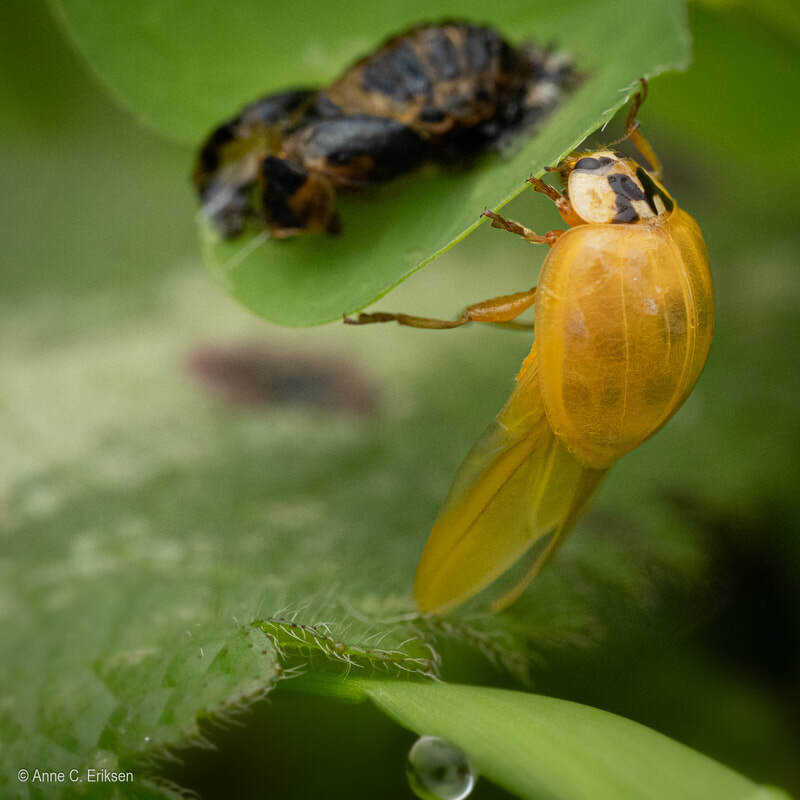 En lys og myk marihøne bakset seg ut av det harde skallet som den hadde ligget inni, det skjedde uten at jeg så det, men jeg var der like etterpå. Se tekstingen på bildene. Klikk på bildene for å se dem større.