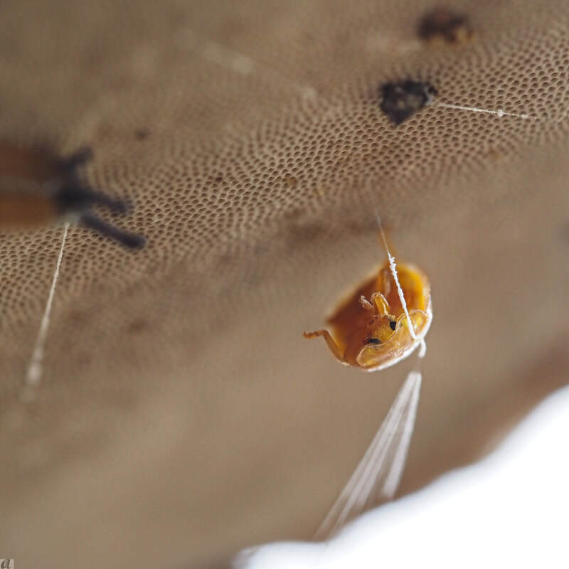Et lusebarn er født, vises svakt (og uskarpt) øverst på larven.