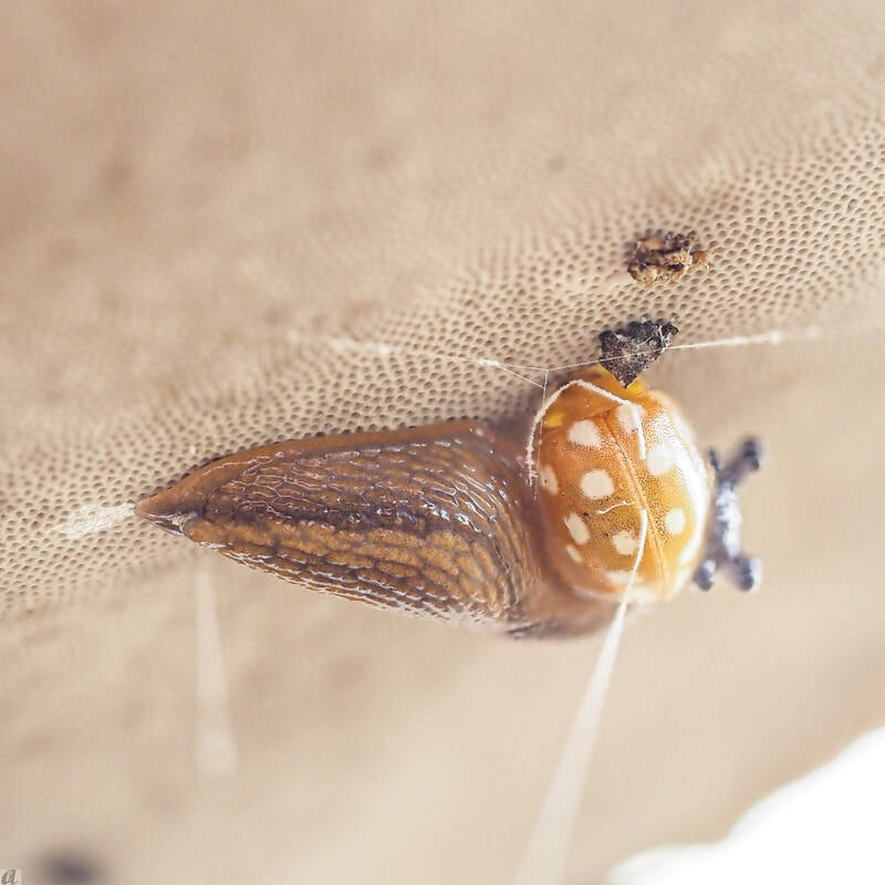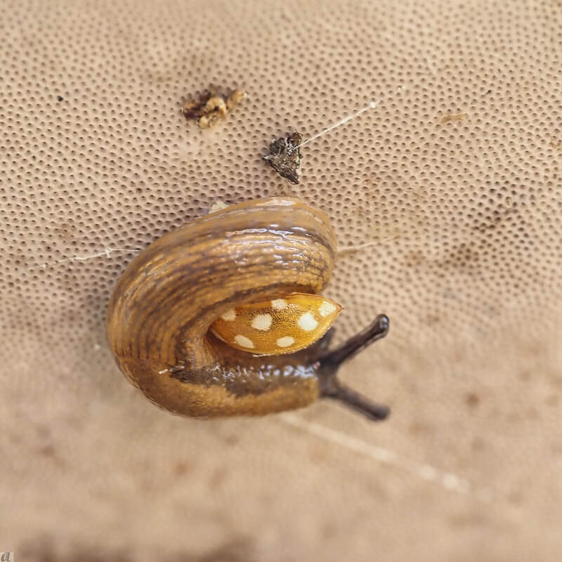 Neste dag kom jeg tilbake, marihøna hang der fortsatt, ingen tegn til liv. Da så jeg plutselig at det kom en liten brunsnegle i stor sneglefart inn fra venstre. Kanskje er marihøneskallet for hardt for den å trenge gjennom , så smartingen smøyg seg under marihøna, og klarte å vippe den opp og få tilgang til den mykere delen under.