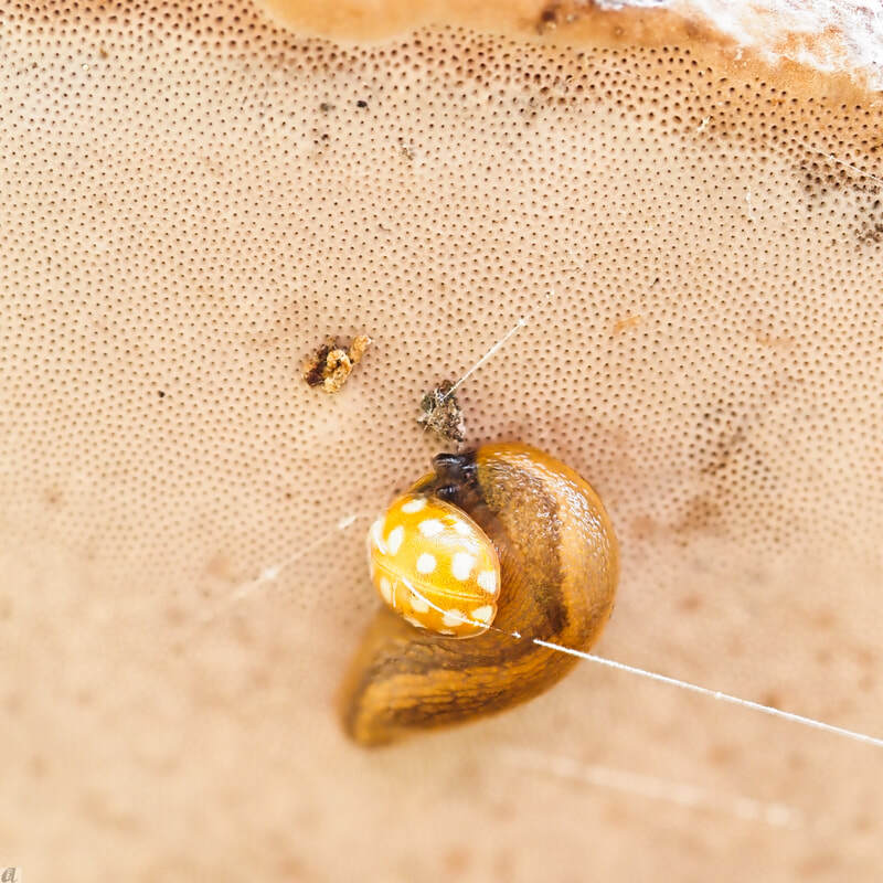 Det var nok flere marihøner som ble klekket samtidig, og jeg lurer på hvorfor den ene ble hengende uten å komme seg løs, og endte sine dager som føde for en brunsnegle. Naturen er brutal. Det var derfor ekstra hyggelig å se en annen marihøne vandre oppover trestammen.