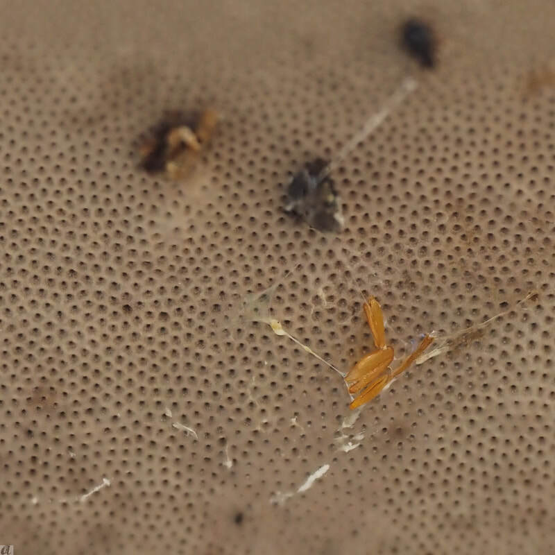 Denne edderkoppen er så liten at jeg bare så en prikk. Gjennom makrolinsa så jeg en søt liten edderkopp, og etter å ha konferert med fagfolk fikk jeg vite at det er en variant av agurkedderkoppen, nærmere bestemt en Oransjegrønnvever (Araniella displicata). Mer info på WIkipedia.