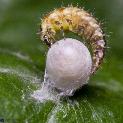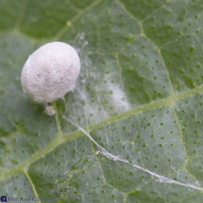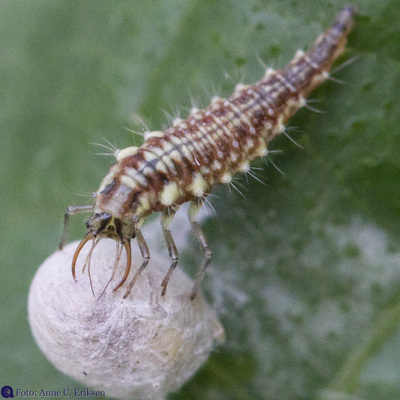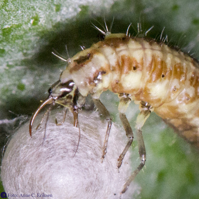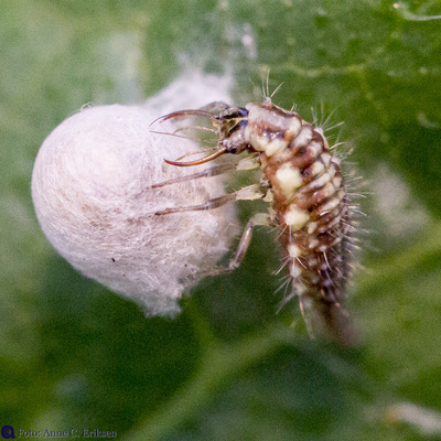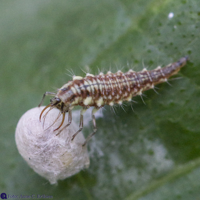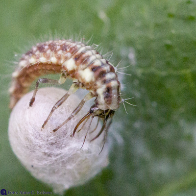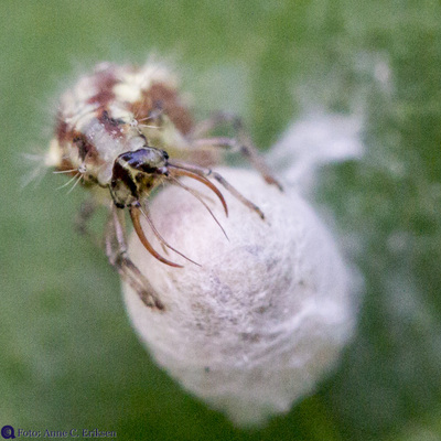 I morges så jeg et tomt skall av et insekt på en squashplante. Siden jeg har vært opptatt av å lese om larven av gulløye (se forrige post), trodde jeg med en gang at dette var en stakkars edderkopp som hadde blitt drept av en gulløye-larve. Larven suger nemlig ut alt det bløte fra lus og egg og annet som det er mulig å få hull på.
