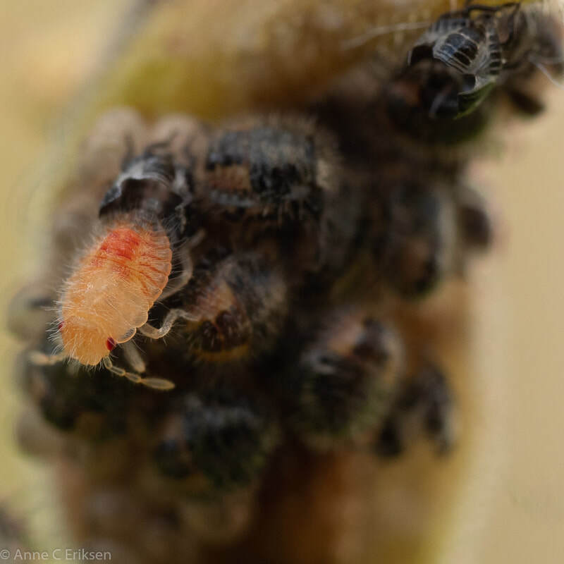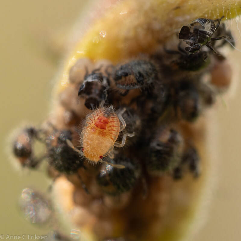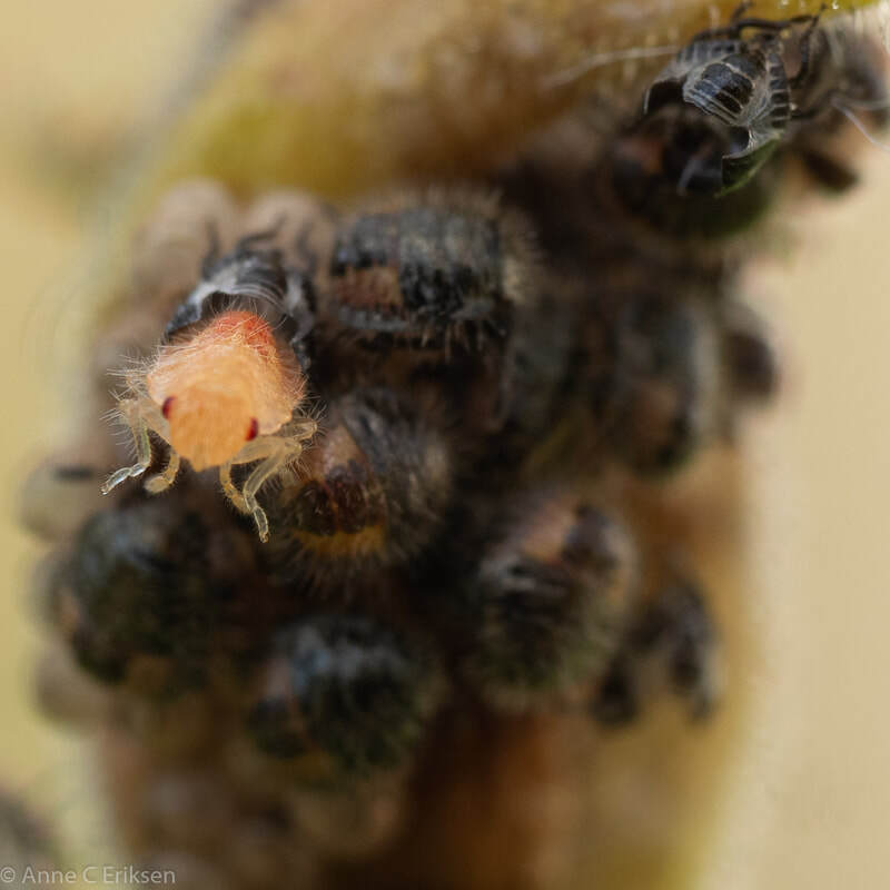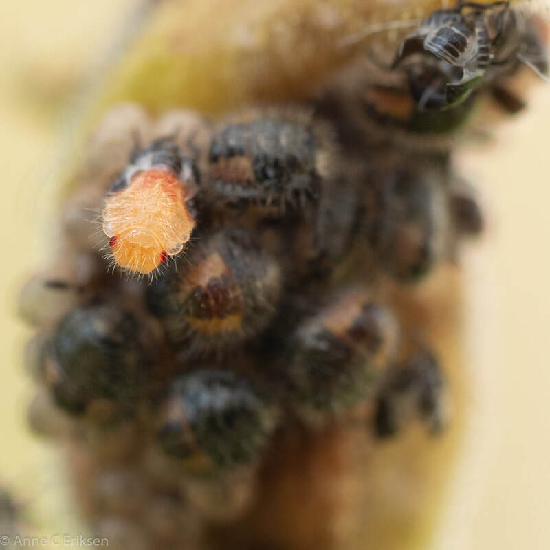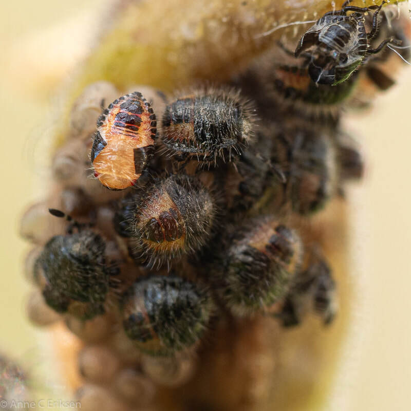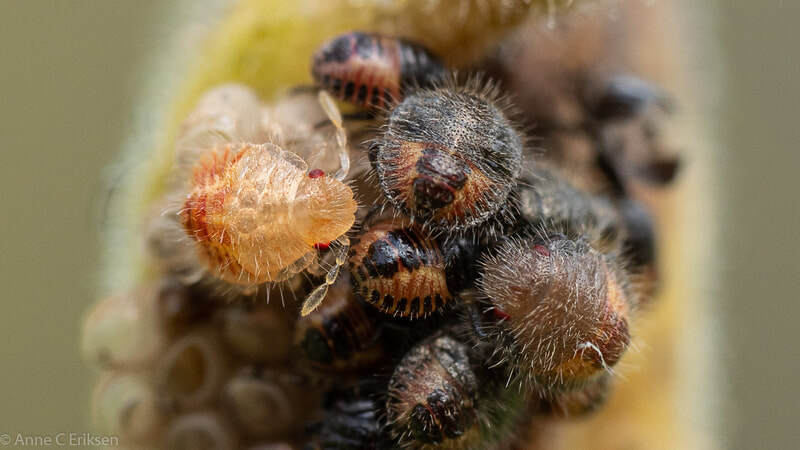 Den femte juli så jeg nyklekkede teger på en avblomstret akeleie (se tidligere post her). Jeg har fulgt med dem hver dag siden, og lurte på hvor lenge de skulle sitte der før de "flyttet hjemmefra". Like etter klekking spiser de rester fra egget de lå i, og tømmer de ubefruktede eggene for mat. Slik er det også i marihønenes verden, mor legger et par egg som barna kan spise når de er klekket. Først etter omtrent ti dager startet de små tegebarna sitt første hamskifte. Det var spennende å følge med på. De er jo så små, så det er ikke mulig å se det uten stor forstørrelse. Jeg har et bra makro-objektiv og kan zoome inn når jeg sjekker bildet i søkeren. I går så jeg en tege som var veldig urolig, den hadde ikke skiftet ham ennå, så jeg fulgte ekstra nøye med på den. Og så begynte skallet sakte sakte å sprekke opp, først en stripe langs ryggen, så en stripe tvers over nakken. Deretter åpnet ryggstripa seg og fronten (eller"ansiktsskallet") sprakk opp. Utrolig spennende å følge med på. Etter litt kom hele hodet fri, de knallrøde øynene var tydelige og den jobbet iherdig for å komme seg ut. Det tok litt tid, men så omsider kunne den krabbe ut. Skallet rundt bakkroppen ble liggende igjen, og en rosa, veldig utsatt og myk tege var fri. Det tok ikke så lang tid før fargen ble mørkere, og til slutt hadde det ytterste blitt hardt skall. Den var skikkelig hårete, og veldig søt. Så vidt jeg vet har tegene 4-5 hamskifter før de blir voksne. Dette jeg så var det første skiftet.